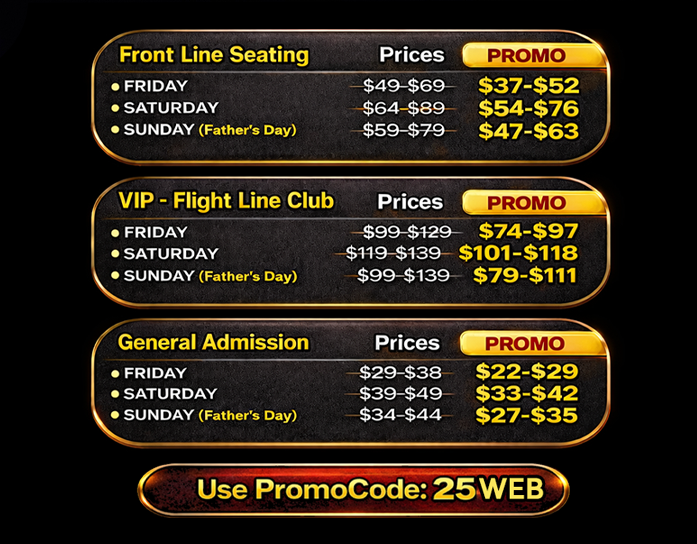Step into the VIP – Flight Line Club, where exclusivity, comfort, and premium amenities elevate your airshow experience. Enjoy the Air Show from the comfort of your own table for the day! Reserve tables of 2-6 seats per table. Single seats are also available.
